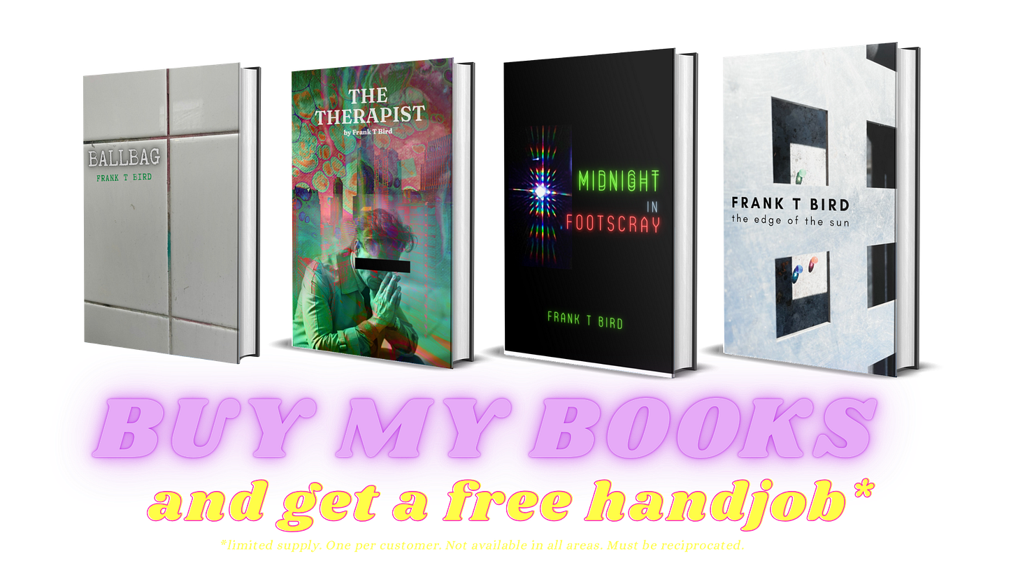 Fuck knows. I look up from my desk at the neighbour, Mrs Flapsberry, who is wearing her orange Thursday bra. Usually, I’d spy on her and have a wank since my wife is at work, but today I just can’t. For the third time this week, I’ve written myself into a fucking threesome. And it’s not with some youthful clueless bronzed coked up fucks on a yacht. It’s with a fat sixty-year-old Irish cuckold and his morning-breath jazz singer wife.