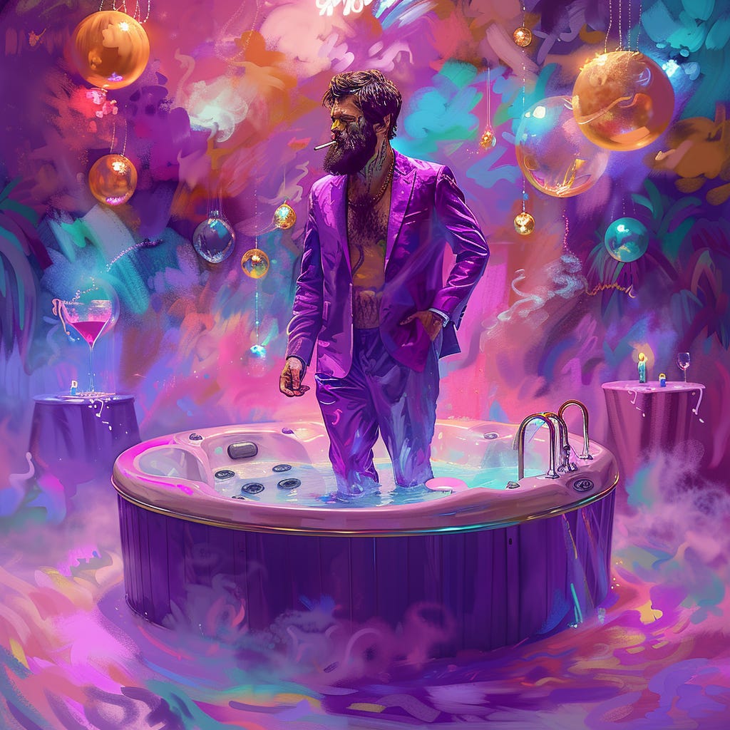 “Frankie, my Boy. If only I could stay in this jacuzzi all night instead of having to go to this damn cocktail party.” He slammed his fist in the water and looked at me like I was Hans Gruber. That’s when it came to me — the jacuzzi suit. It’s a suit, and yet it’s a jacuzzi or, to put it another way, it’s a jacuzzi that you wear.