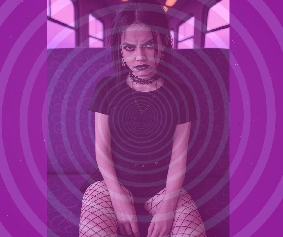 That’s a good sign. Maybe she’s a bit in heat and has noticed the outline of my Finnochiona through my thin grey sweats. She’s wearing a short tartan skirt to match her transparent legs. Her fishnets are torn—probably self-inflicted. I try to get a glance up the skirt, but it’s dark up there like this chick’s soul.