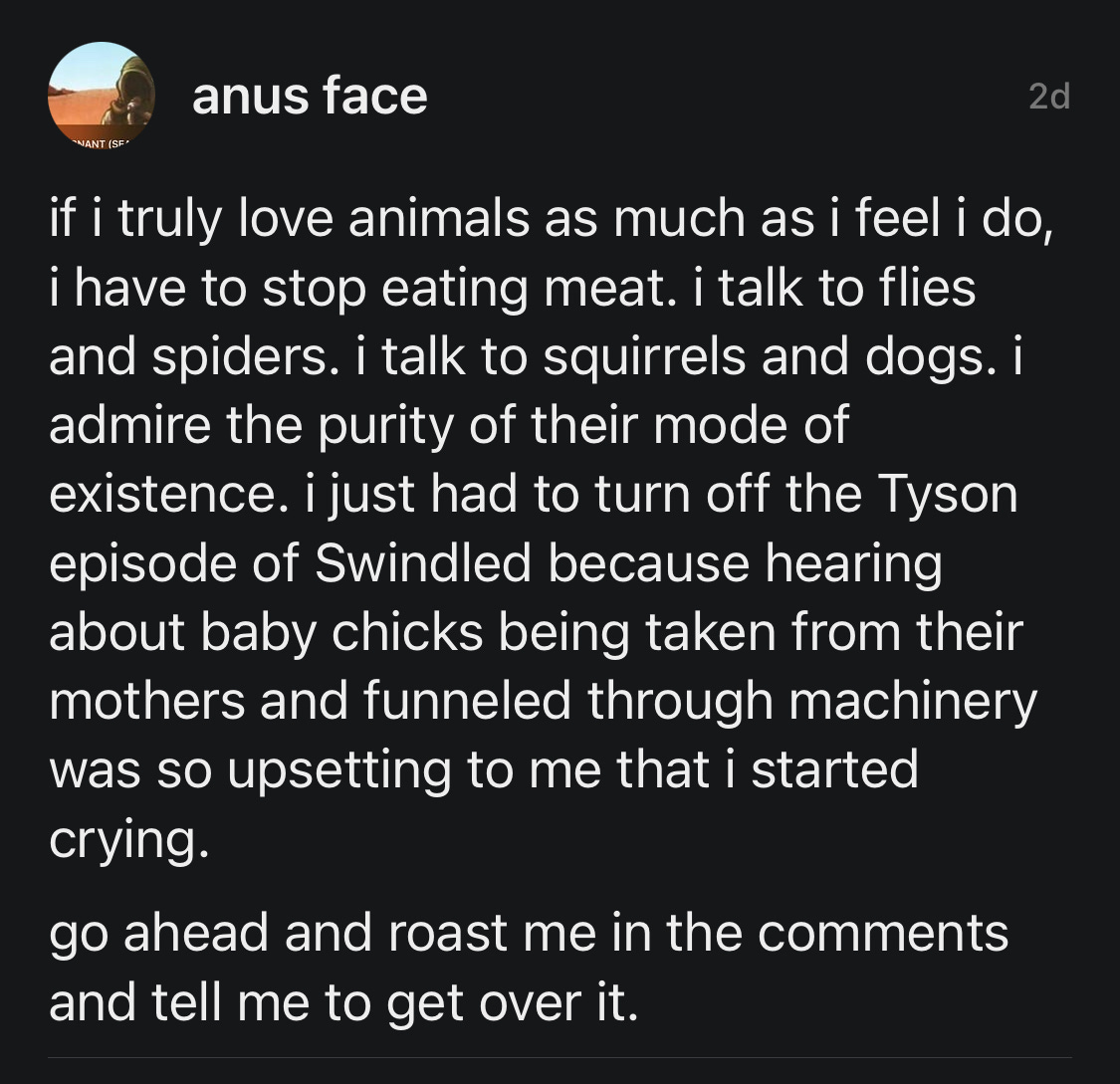 But I knew some beefed up jackass on the carnivore diet would be telling anal face that he had some kind of condition cos eating meat is a natural behaviour. And I fucking hate that we’ve entered an era where we’re meant to think theres something fucking wrong with us if we feel like shit for eating meat.